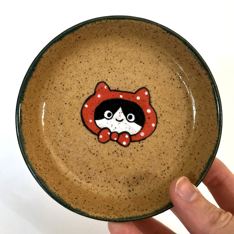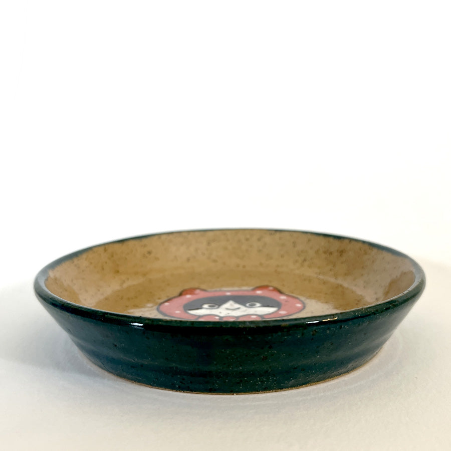 Small dish/shallow bowl with babushka cat decoration and glossy clear interior glaze/deep teal exterior glaze.