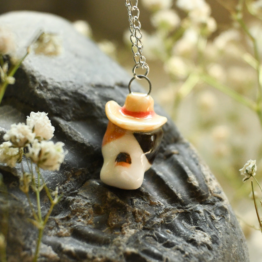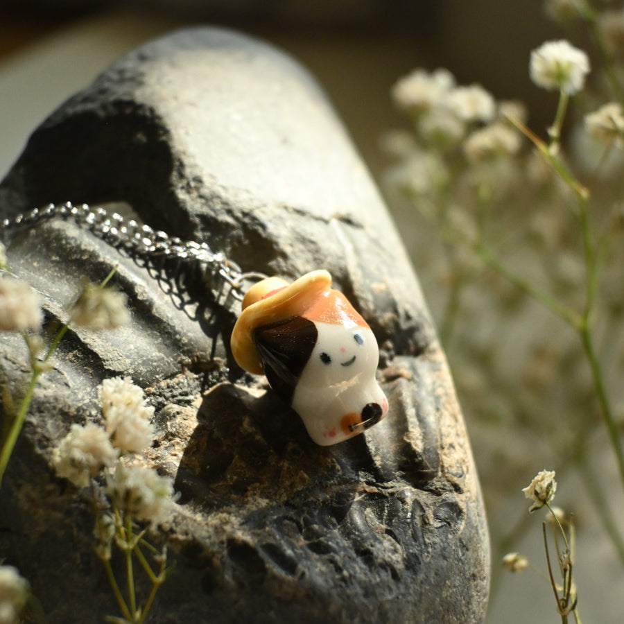 Hand-sculpted and painted tiny porcelain cat charm on an 18" necklace chain with extender and lobster clasp. Metal components are nickel-free stainless steel.